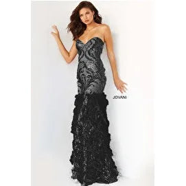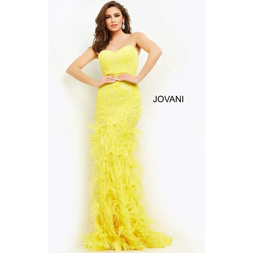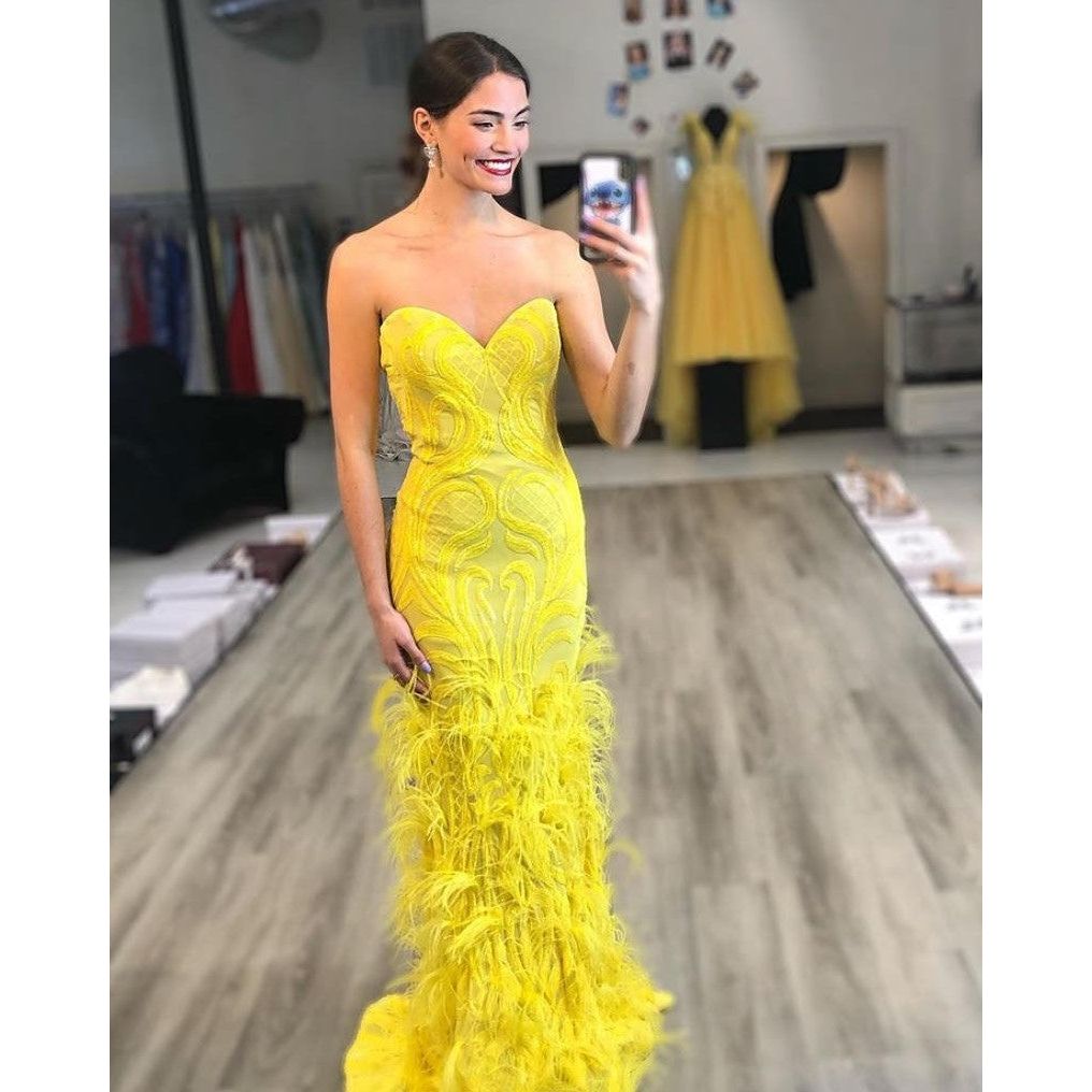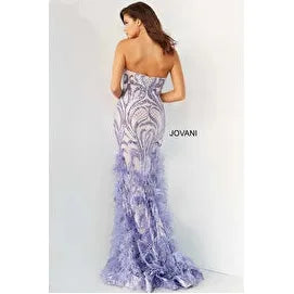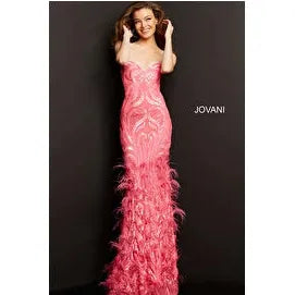 - Details: Sequin embellished sheath prom dress, floor length skirt with feather bottom, strapless bodice with sweetheart neckline.